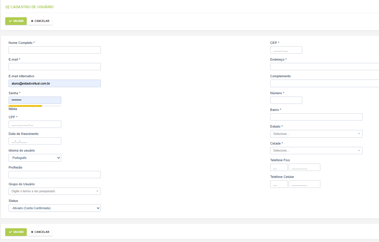 Cada campo tem sua importância. O campo Nome precisa ter ao menos duas palavras para ser aceito. No campo e-mail é importante que seja um e-mail válido. Esse e-mail será utilizado para comunicações, envio de boletos, recuperação de senha, notificações de horários e outros. Sendo algo tão importante o mesmo tem de ser único. Um e-mail só pode existir na plataforma para um único usuário. O e-mail alternativo não é obrigatório, serve apenas como um cadastro de dado suplementar. A senha recomendamos que tenha ao menos 8 caracteres, números, letras maiúsculas e minúsculas e ao menos um caractere especial como @#! Dentre outros. O CPF tem de ser um CPF válido. Isso protege você gestor da plataforma. Caso algum usuário haja de forma ilegal como incitar o ódio, difundir conteúdos de cunho racista, sexista ou qualquer outro que fira a legislação brasileira, você terá como responsabilizar isoladamente a pessoa que cometeu o crime. Data de nascimento, deve ser no formato DD/MM/AAAA, esse dado serve para traçar um perfil de seu consumidor. Idioma, essa informação deve ser utilizada para plataformas multilíngues. Caso vá atuar apenas em território nacional, não há necessidade de se alterar esse campo. Profissão, outra ferramenta para mapear o perfil do seu cliente. Grupos do usuário, esse campo é muito importante, é com ele que se define o tipo de acesso de cada usuário.