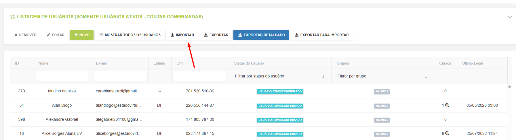 Para a inclusão em massa de usuários basta ir em IMPORTAR na tela de listagem de usuários como mostra a imagem 07: