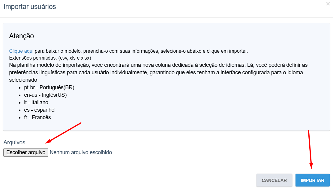 Após preencher com todos os usuários, salve o arquivo e solicite a importação clicando em “Escolher arquivo” secionando a planilha salva, e depois clicando no botão IMPORTAR como mostra a imagem 10.