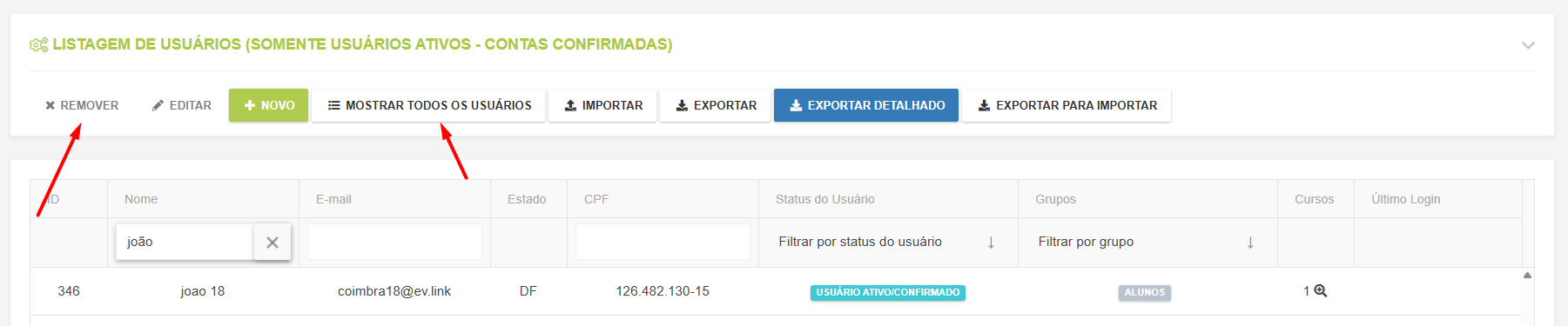 Uma informação importante é que os usuários são guardados para sempre na plataforma, assim como seus históricos de utilização, acessos ou relatórios de atividade de curso. Tanto aluno como professor, administrador ou qualquer outro tipo criado, ele sempre ficará armazenado na plataforma. O que muda é que, se o usuário for selecionado na lista, e depois for clicado em remover como indicado na imagem 04 abaixo, esse usuário será desabilitado. E para listar todos os usuários, ativos ou não, basta clicar em mostrar todos os usuários como indicado na imagem 04 abaixo.