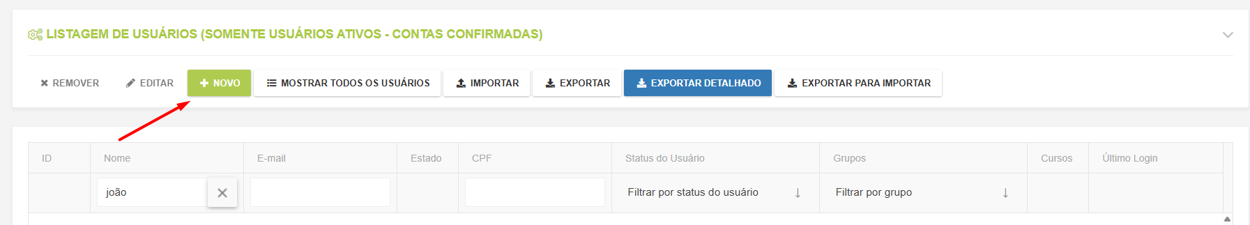 Existem algumas formas de inclusão de usuários na plataforma. A primeira delas é a inclusão manual de um usuário. Para isso basta clicar em NOVO conforme a imagem 05 abaixo.